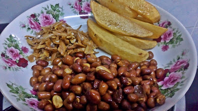 Kentang yang digoreng berbaji itu pun digoreng garing dan diketepikan. Kacang tanah dan ikan bilis juga digoreng berasingan. Boleh gunakan minyak yang sama.