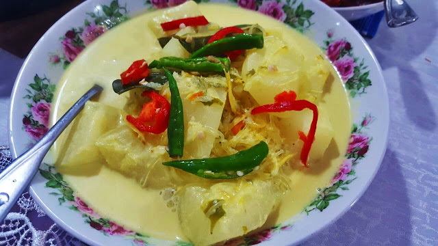 3. Masukkan bahan tumbuk dalam periuk bersama buah kundor, santan cair dan serbuk kunyit. Masak dengan api perlahan hingga mendidih sambil dikacau selalu. Pastikan buah kundor itu telah lembut.