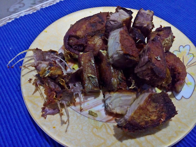 Ikan tongkol itu dilumurkan dengan garam dan serbuk kunyit. Panaskan minyak dan digoreng ikan itu hingga garing. Lepas itu ikan goreng itu dibuangkan tulangnya. Jadilah ikan itu ketul kecil-kecil, senang juga nak makan. Ketepikan.