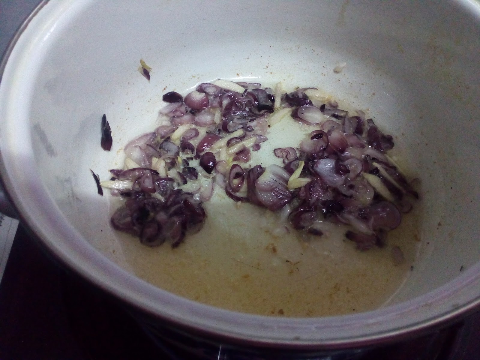 2. Panaskan minyak dan tumis bawang merah dan bawang putih hingga kekuningan.